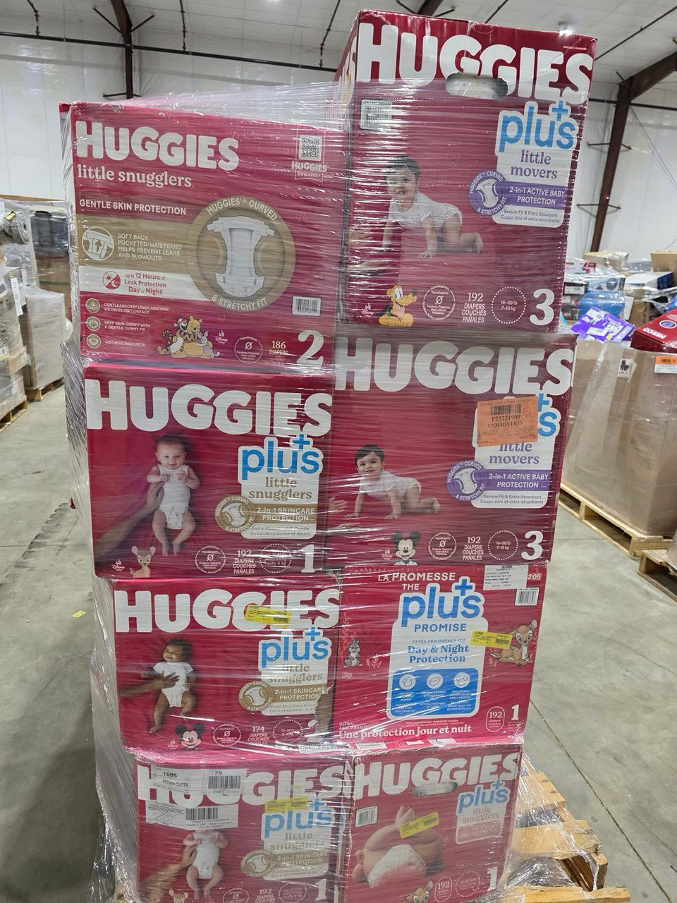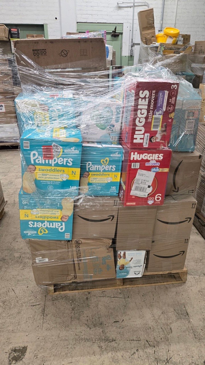 - Liquidation pallets often contain a mix of top brands like Pampers and Huggies.
